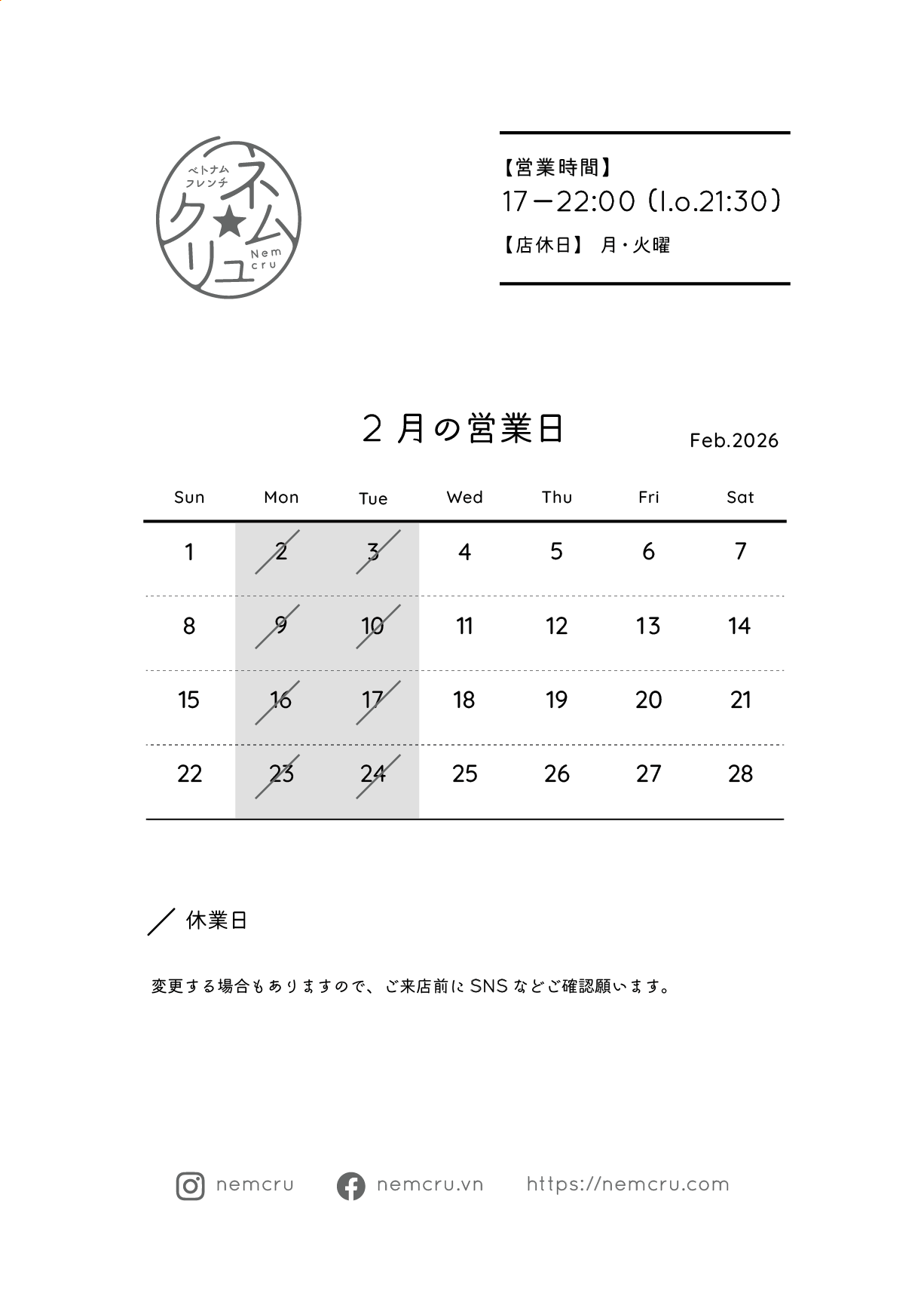 27Jan2026 2026年2月の営業日のお知らせ Post Share RSS 春の気配と、新しい器で楽しむコムチェン 皆さま、こんにちは。 少しずつ寒さの中にも春の気配を感じる季節になりましたね。本日は、▼2月の営業スケジュールのお知らせ▼と、今ぜひ召し上がっていただきたいおすすめの一皿をご紹介します。(1/27現在) ひと足早い春を味わう「コムチェン」 今月のアイキャッチ写真は、おすすめメニューの「コムチェン」角煮と菜の花の炒飯です。 じっくりと時間をかけて煮込んだベトナムの豚角煮「ティットコー」の濃厚な旨味を、一粒一粒が香ばしい炒飯に閉じ込めました。 自家製ラードの甘みと、魚醤(ヌクマム)の奥深いコクが口いっぱいに広がります。 さらに、ミャンマーの発酵茶葉「ラベソー」の爽やかな酸味と、菜の花特有のほろ苦さをプラス。 重なり合う多層的な味わいは、一口ごとに新しい発見があるはずです。 料理を彩る新しい器 この一皿をさらに引き立ててくれているのは、先日 pejite青山 さんで出会った表情豊かな器です。 手仕事の温もりを感じる器の上で、旬の菜の花や赤蕪の色彩が鮮やかに躍ります。 2月の営業時間 ::::::::::::::::::::::::::::::::::::::::: ディナー 17~22:00 (l.o.21:30) ::::::::::::::::::::::::::::::::::::::::: ✳︎変更する場合は当サイト、Instagram等でお知らせします。 店内に生けた**白木蓮(ハクモクレン)**も、うぶ毛に包まれた蕾から少しずつ花を咲かせ始めました。 季節の移ろいを感じながら、温かいお料理をごゆっくりお楽しみください。 ⌘ 2026年1月の営業日のお知らせ 最近のお知らせ一覧お知らせ一覧 2026年1月の営業日のお知らせ 2025.12.29 2025年12月の営業日のお知らせ 2025.11.28 2025年11月の営業日のお知らせ 2025.10.27 2025年10月の営業日のお知らせ 2025.09.26 2025年9月の営業日のお知らせ 2025.08.27