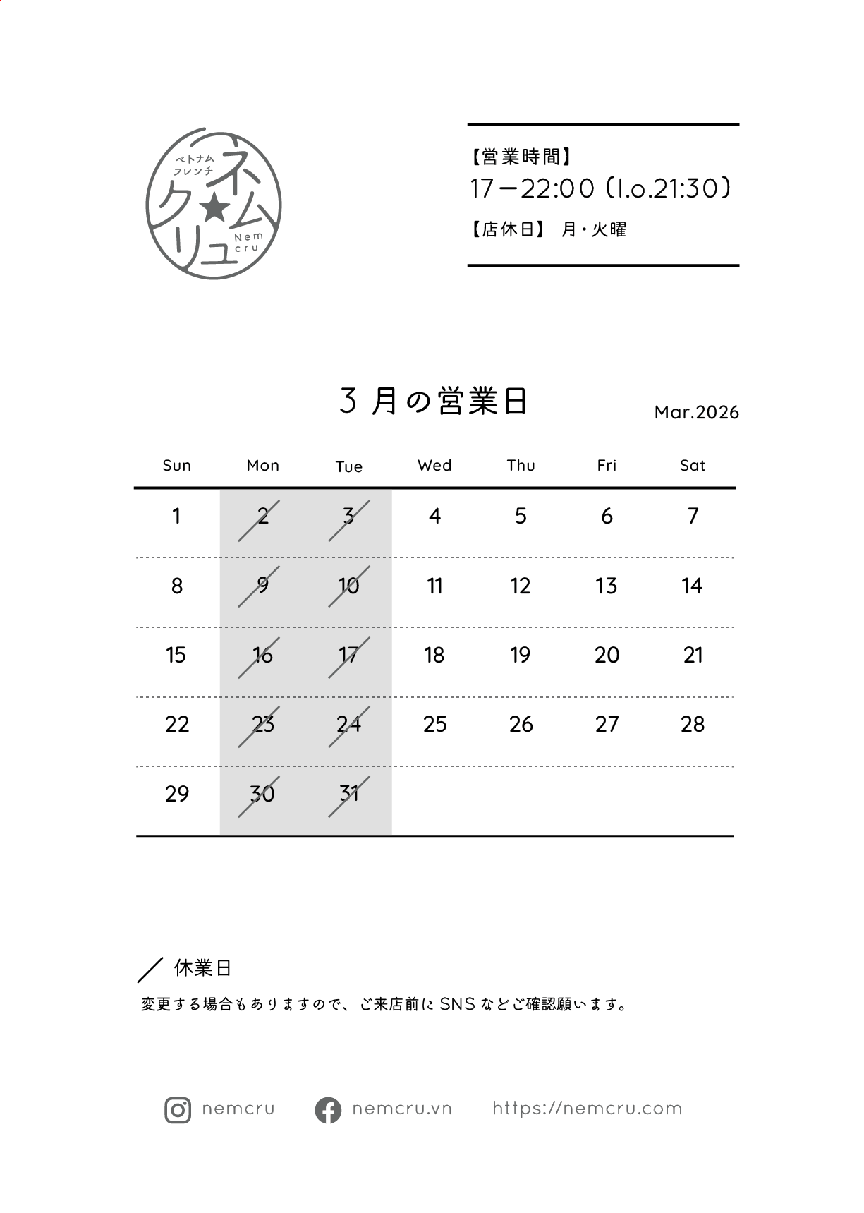 27Feb2026 2026年3月の営業日のお知らせ Post Share RSS ミモザとお客様にいただいたレモン。 優しい心遣いと鮮やかな色彩に、心がほっこり温まります。 いつも温かなお心寄せをありがとうございます。 さて、3月の営業スケジュールをご案内します。 3月の営業時間 ::::::::::::::::::::::::::::::::::::::::: ディナー 17~22:00 (l.o.21:30) ::::::::::::::::::::::::::::::::::::::::: ✳︎変更する場合は当サイト、Instagram等でお知らせします。 2026年2月の営業日のお知らせ 最近のお知らせ一覧お知らせ一覧 2026年2月の営業日のお知らせ 2026.01.27 2026年1月の営業日のお知らせ 2025.12.29 2025年12月の営業日のお知らせ 2025.11.28 2025年11月の営業日のお知らせ 2025.10.27 2025年10月の営業日のお知らせ 2025.09.26