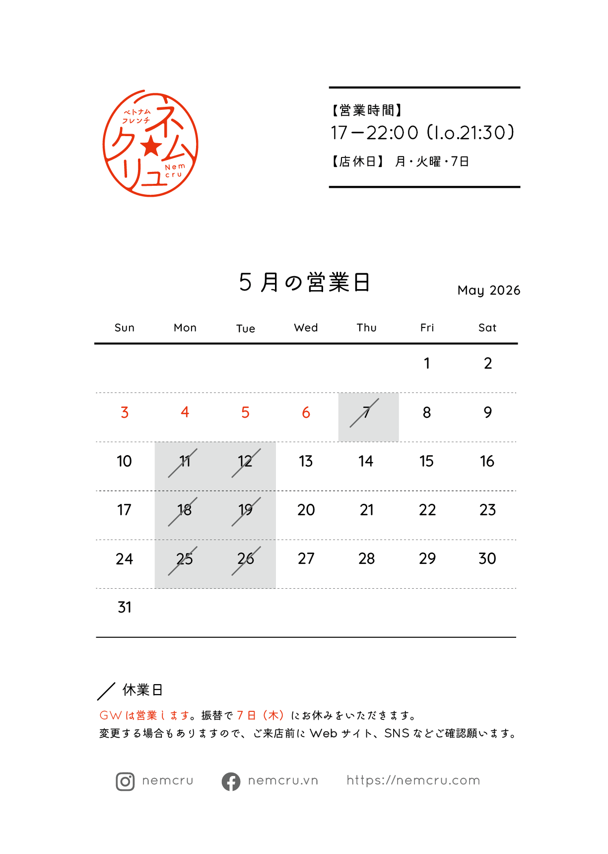26Apr2026 2026年5月の営業日のお知らせ Post Share RSS 5月の大型連休、どのようにお過ごしの予定でしょうか?お休みの方も、お仕事の方も、心地よい新緑の季節を楽しみましょう! GW期間中の営業日について、少し変則的になりますのでお知らせいたします。 通常、月曜・火曜は定休日をいただいておりますが、 5月4日(月)と5日(火)は休まず特別営業いたします!「普段は平日休みがなくて行けない…」という方も、 ぜひこの機会に遊びにいらしてくださいね。誠に勝手ながら、連休明けの5月7日(木)を振替休日とさせていただきます。 年 日付 曜日 営業状況 2026 5/4 月・祝 特別営業 5/5 火・祝 特別営業 5/6 水・祝 通常営業 5/7 木 振替休日 5月の営業時間 ::::::::::::::::::::::::::::::::::::::::: ディナー 17~22:00 (l.o.21:30) ::::::::::::::::::::::::::::::::::::::::: ✳︎変更する場合は当サイト、Instagram等でお知らせします。 価格改定に関するお知らせ 最近のお知らせ一覧お知らせ一覧 価格改定に関するお知らせ 2026.04.16 2026年4月の営業日のお知らせ 2026.03.30 2026年3月の営業日のお知らせ 2026.02.27 2026年2月の営業日のお知らせ 2026.01.27 2026年1月の営業日のお知らせ 2025.12.29